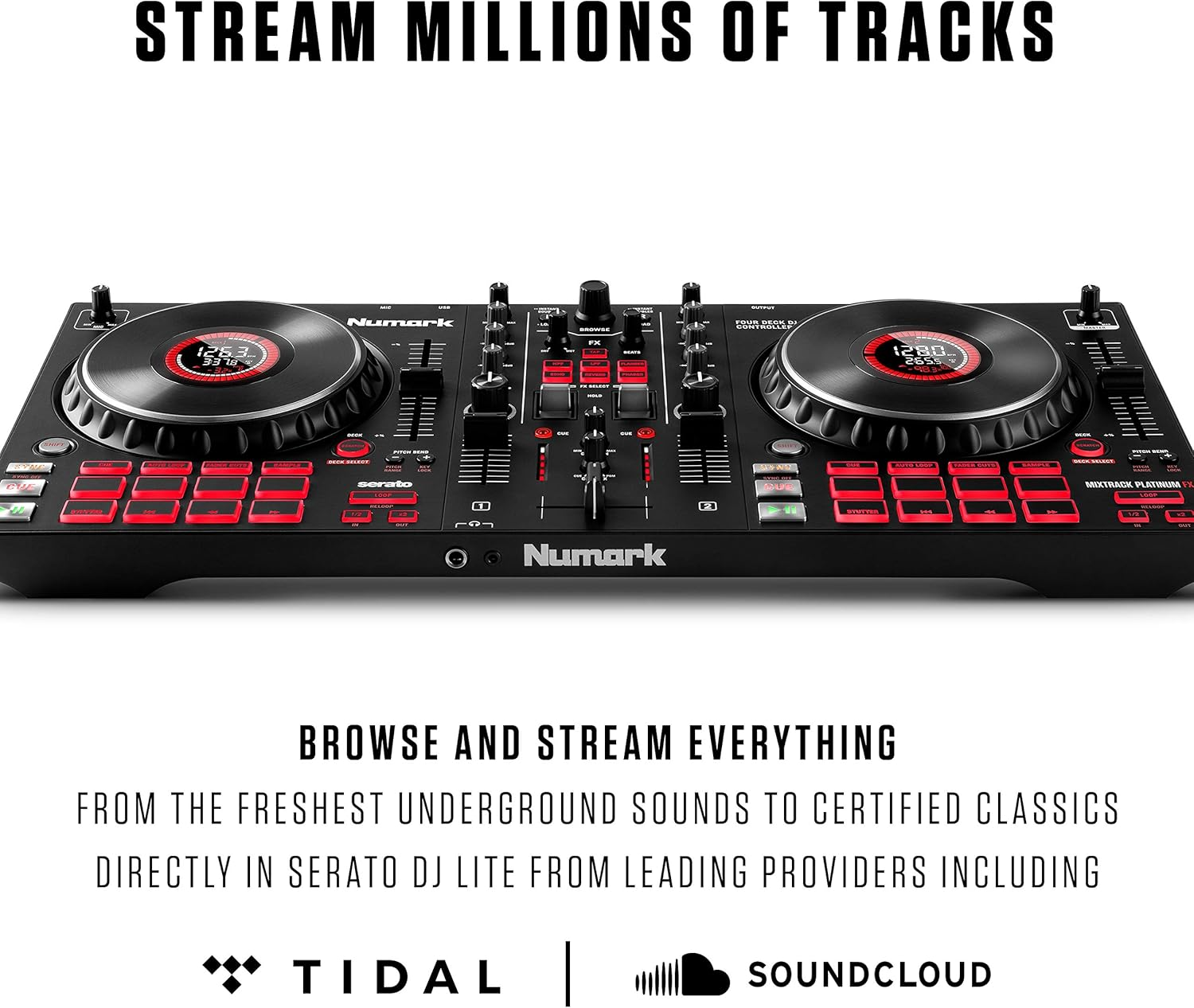 Never run out of music and keep the dance floor shaking! The Mixtrack Platinum FX comes with Serato DJ Lite, giving you access to stream millions of songs via WIFI from TIDAL or SoundCloud. Upgrade to Serato DJ Pro to unlock even more features.